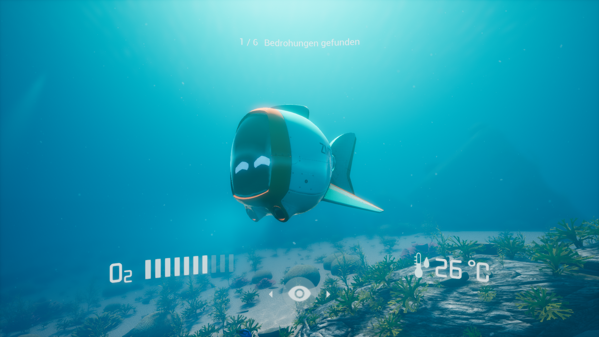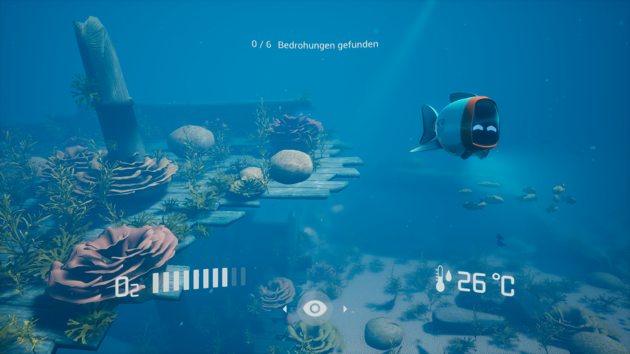 Es entstand eine VR Anwendung, in der Spielende in die Rolle eines*r Forscher*in der Korallenriffe schlüfen und das Riff nach gefährlichen Einflüssen (z.B. mechanische Zerstörung durch Schiffs-Anker, Überfischung oder Eutrophierung durch Abwasserzufuhr) durchforsten. Companion Cora unterstützt die Spielenden dabei und gibt Hilfestellungen, wenn sie an einer Stelle nicht weiterkommen.