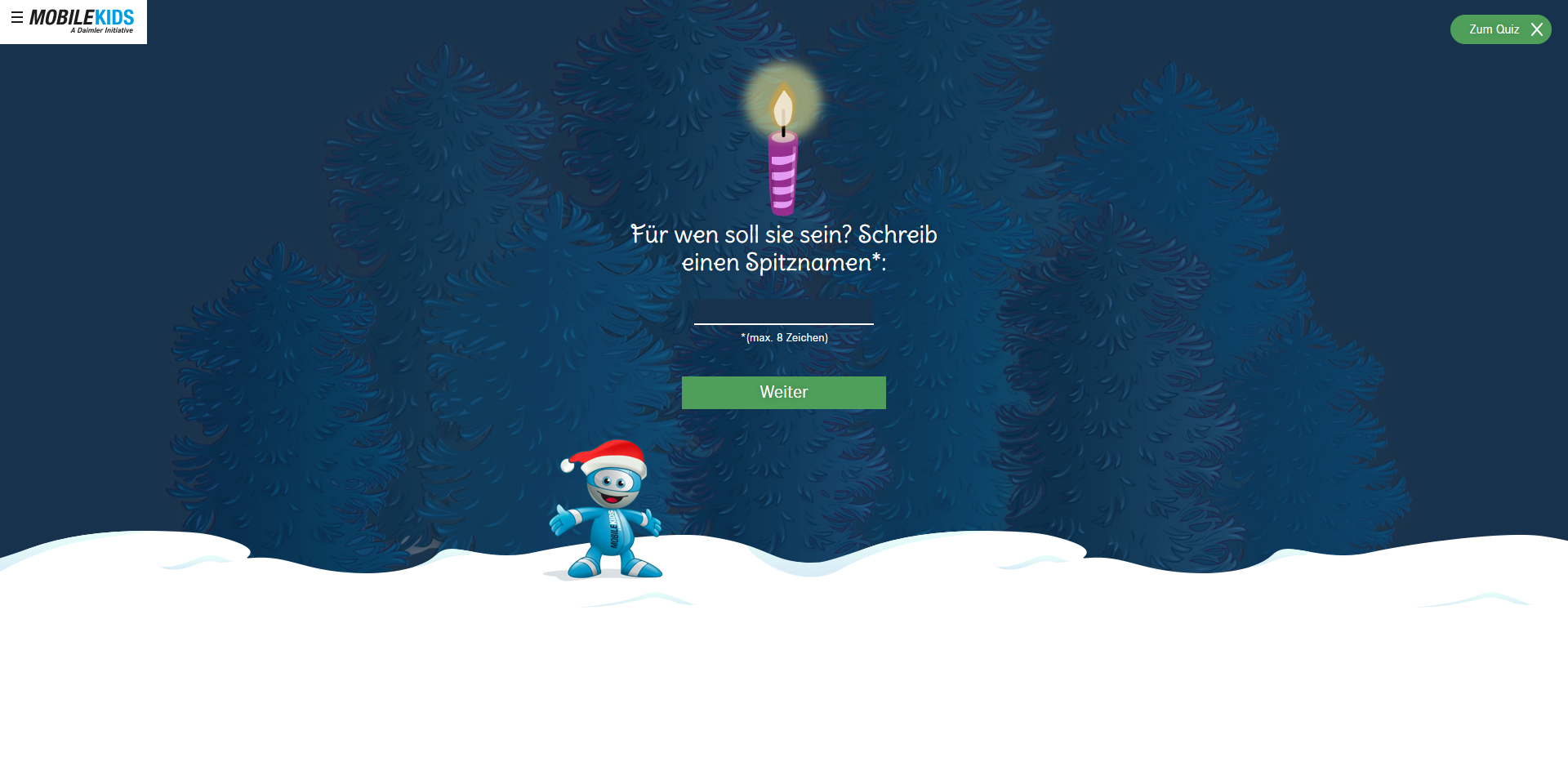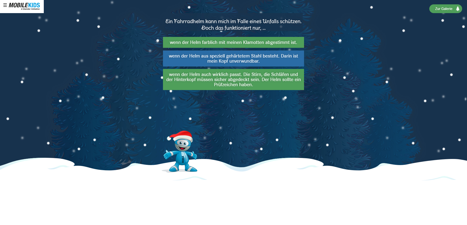 Im Weihnachtsquiz schmücken Spielende gemeinsam virtuelle Weihnachtsbäume, indem sie Fragen zu Verkehrssicherheit richtig beantworten. Die insgesamt über 60 Fragen sind humorvoll formuliert und werden zufällig angezeigt. Durch das gemeinsame Schmücken eines Baumes wird außerdem das Gemeinschaftsgefühl der MobileKids-Community gefördert.