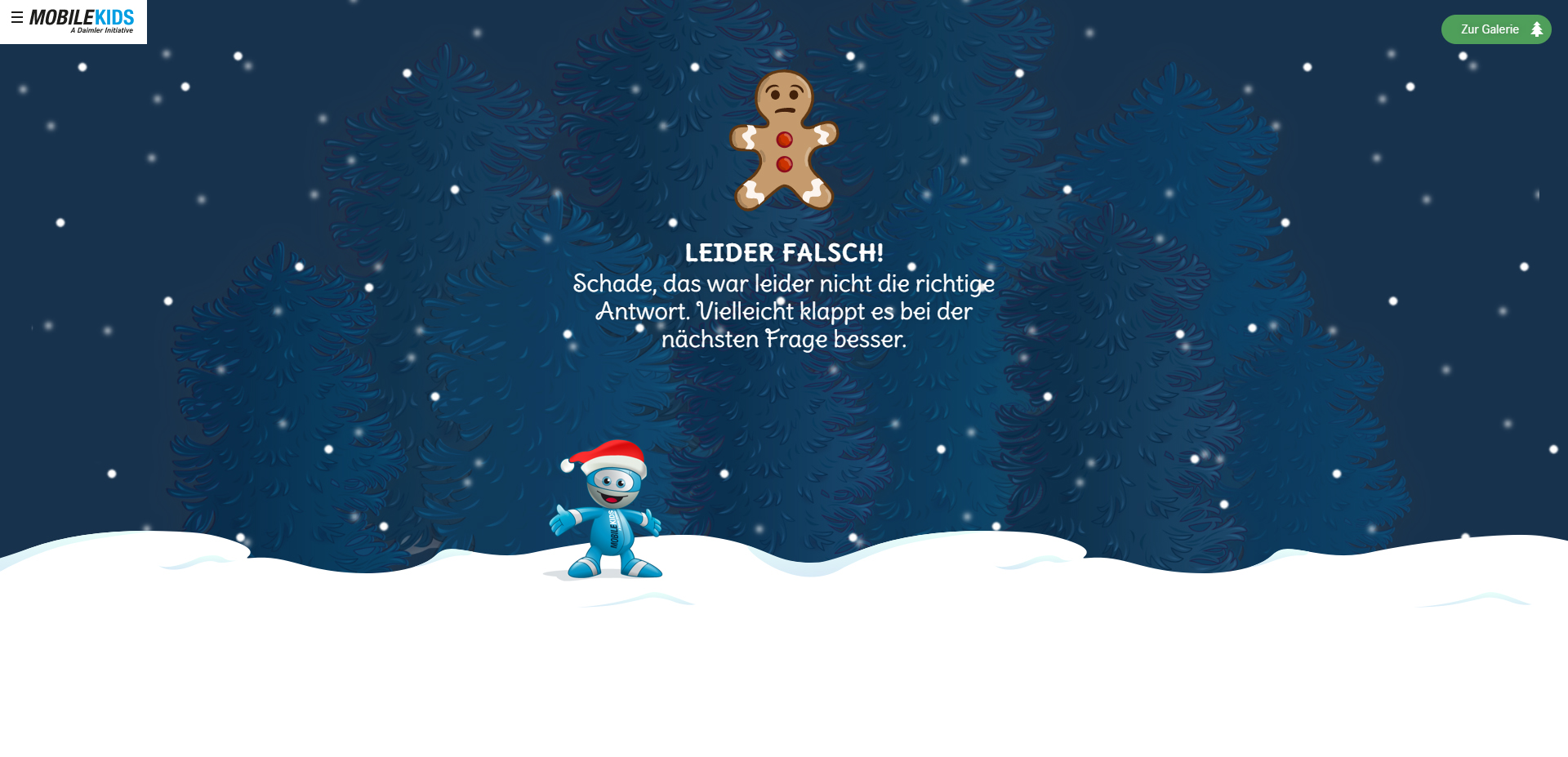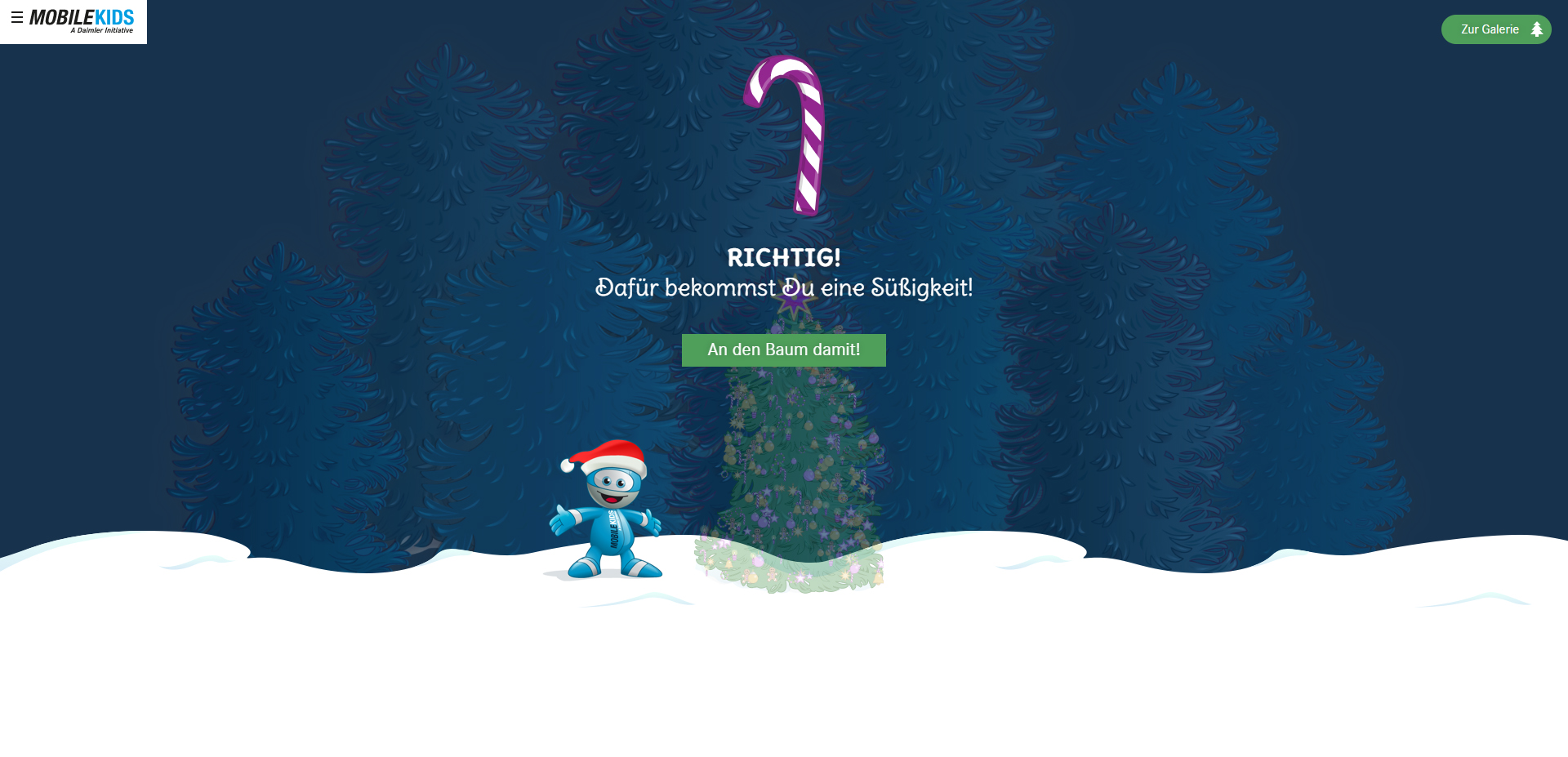 Für jede richtige Antwort erhalten Spielende ein Ornament zum Schmücken eines virtuellen Weihnachtsbaums. Bei fünf richtigen Antworten in Folge kann das Ornament sogar einem lieben Menschen gewidmet werden. Das Quiz ist dabei als Endlosspiel angelegt. Das heißt alle Fragen werden randomisiert und auch wiederholt angezeigt. Motivierend wirkt dabei nicht nur der Wunsch, die Weihnachtsbäume zu schmücken sondern auch die Tatsache, dass die MobileKids-Community gemeinsam zusammenarbeitet.