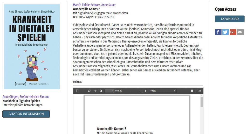 Im Rahmen unseres Beitrages für den Sammelband „Krankheit im digitalen Spiel: Theorien, Themen, Analysen.“ diskutieren Dr. Martin Thiele-Schwez und ich anhand von fünf Thesen, wie wir Games sinnvoll im Gesundheitswesen nutzen können. Wir greifen dabei auf unsere langjährige Erfahrung einerseits in der medienpädagogischen Arbeit mit Spielen und andererseits in der Entwicklung von Spielen zurück. Wir sehen Games vor dem Hintergrund als ein Medium mit hohem Potential – sowohl inhaltlich als auch technisch – aber auch mit Herausforderungen und Grenzen.